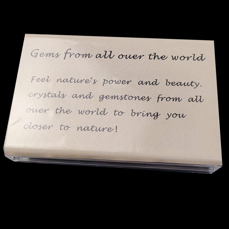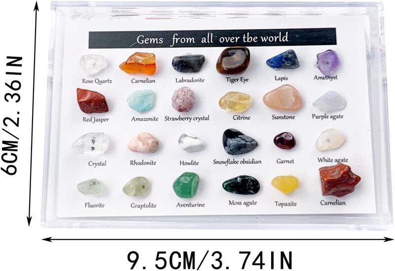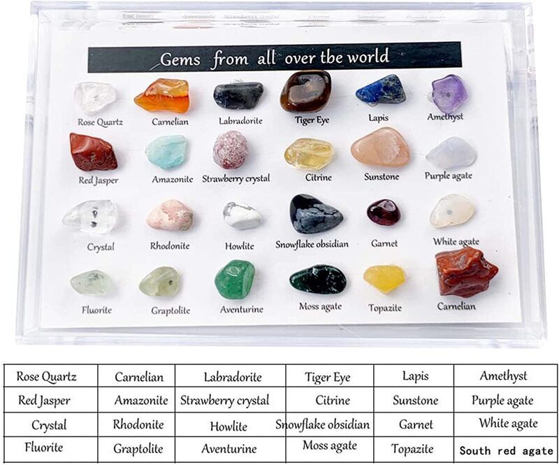 Package Include --- 24 kinds of natural crystal ore stone, includes Rose Quartz, Carnelian, Labradorite, Tiger Eye, Lapis, Amethyest, Red Jasper, Amazonite, Strawberry Crystal, Citrine, Sunstone, Purple Agate, Crystal, Rhodonite, howlite, Snowflake Obsidian, Garnet, White Agate, Fluorite, Graptolite, Aventurine, Moss Agate, Topazite, South Red Agate.
