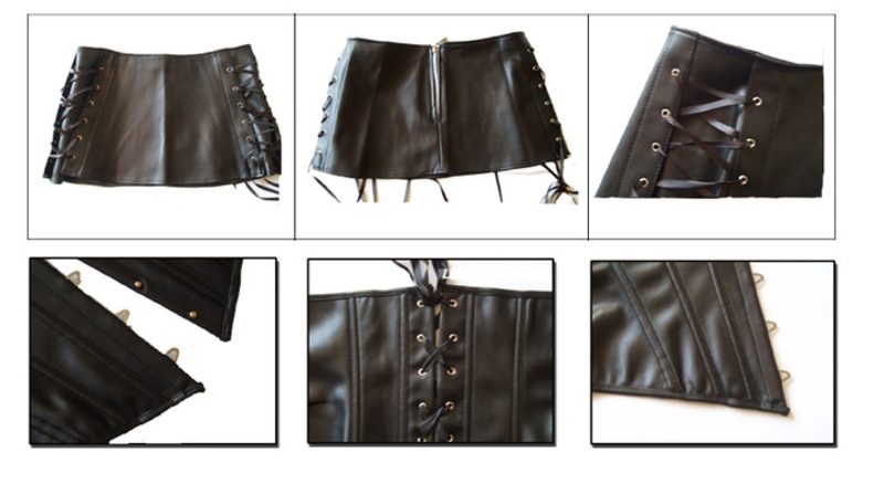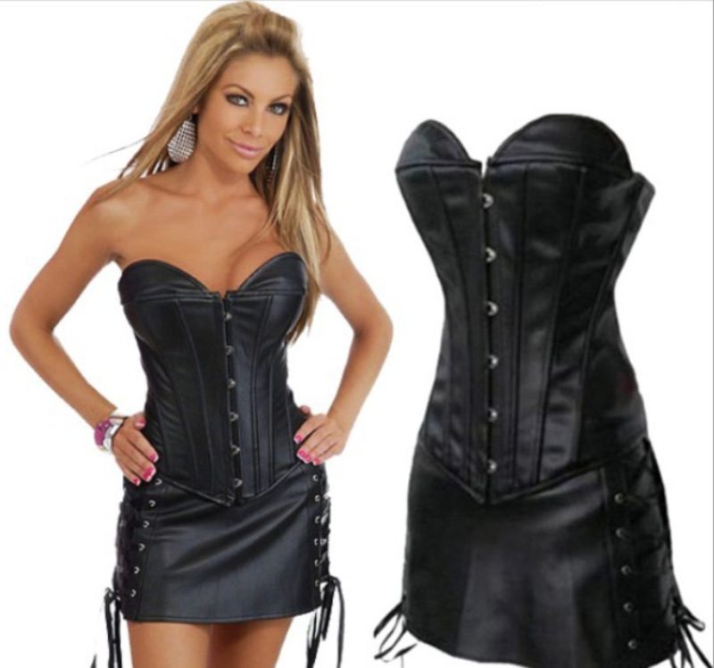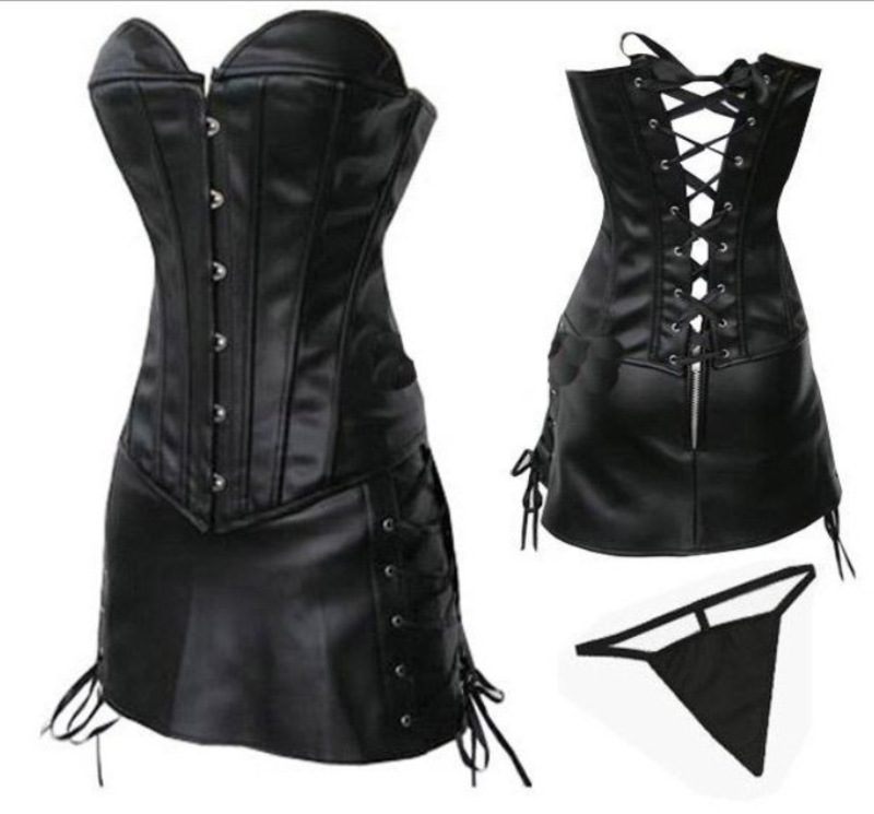 Black Burlesque Cosplay Goth Black Strapless PU Leather Basque Shapewear Mini Dress Set Gothic Retro Vintage Steampunk Corset Halloween Costume Top Womens Clothing Clothes