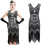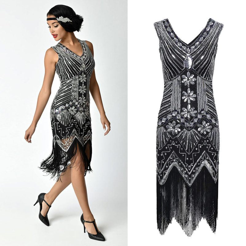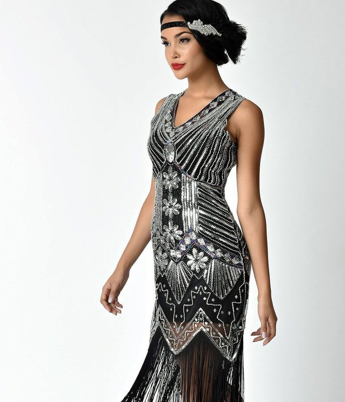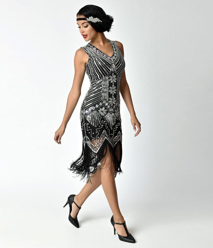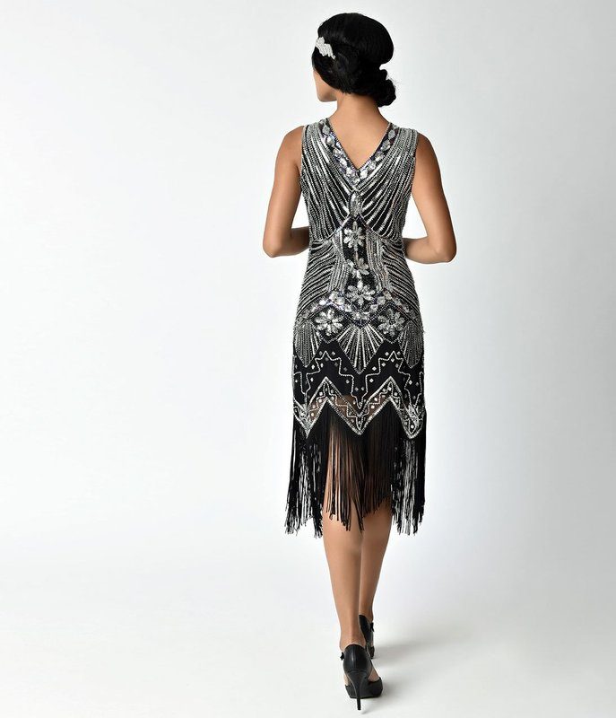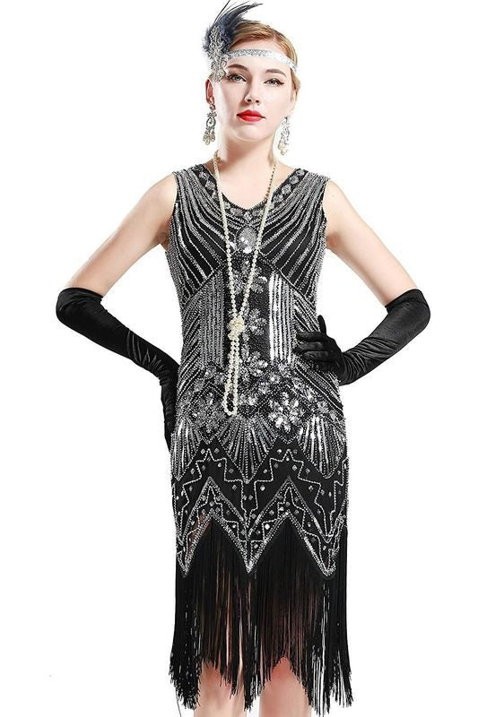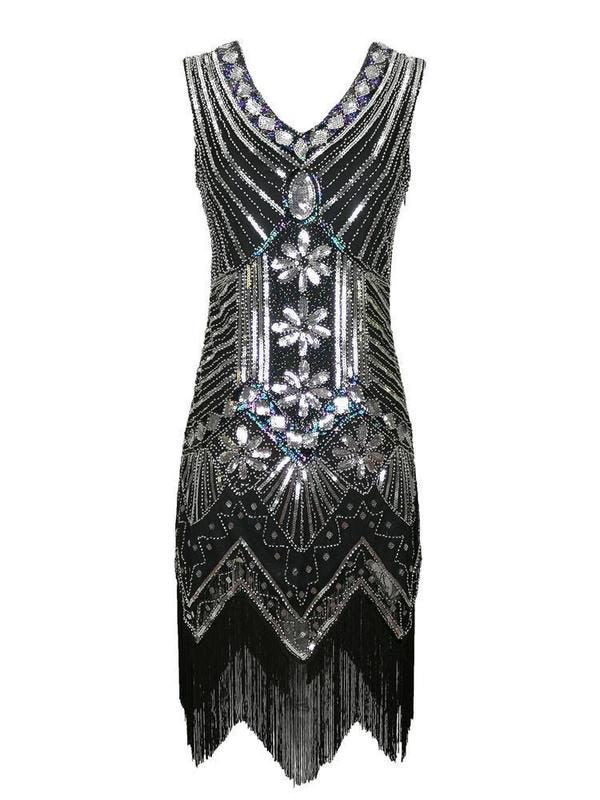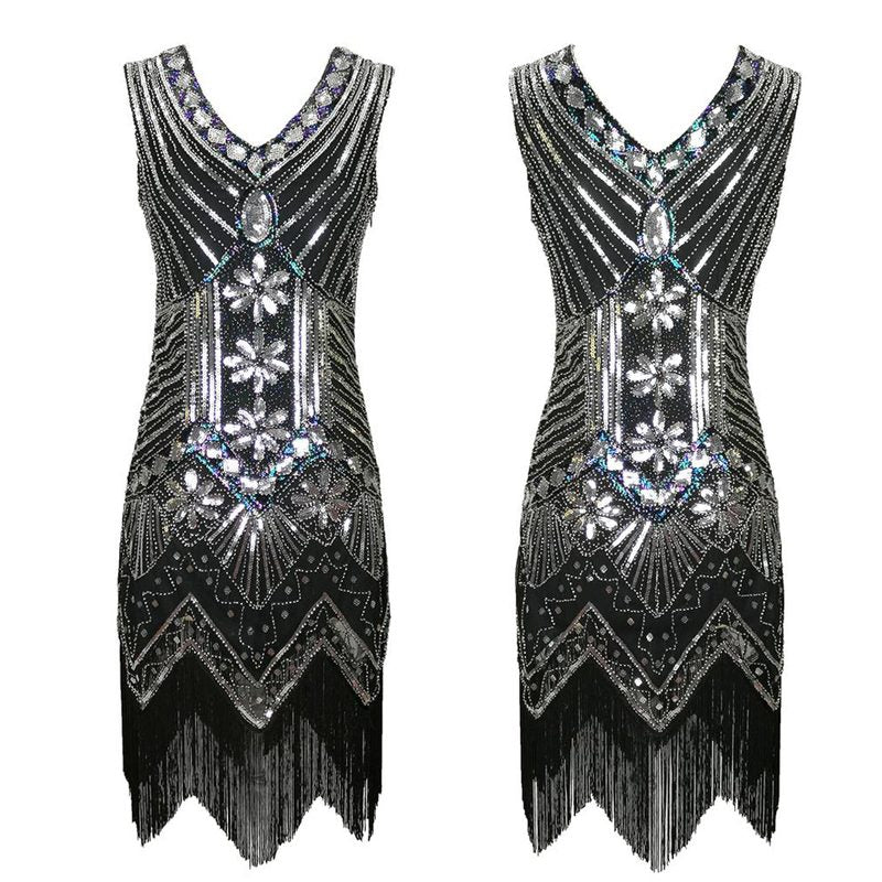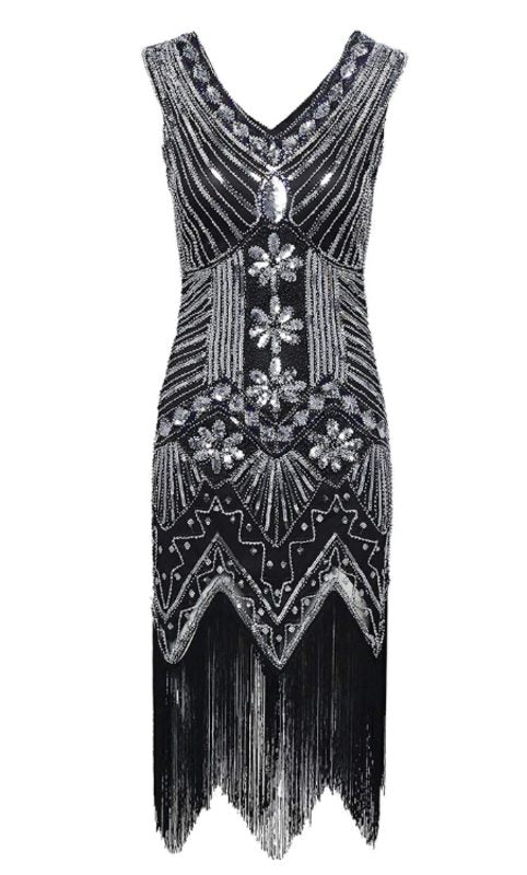 Quality Vintage Black Silver Beads Sequin Fringed Tassels Hem Party Flapper Dress Boutique Party Dress Womens Clothing Clothes Midi Summer Wrap Evening Cocktail Dresses Plus Size