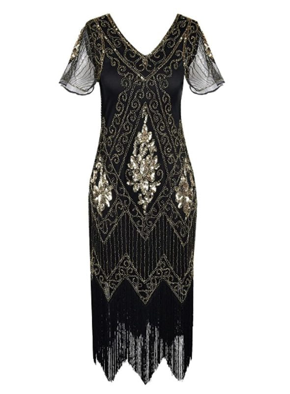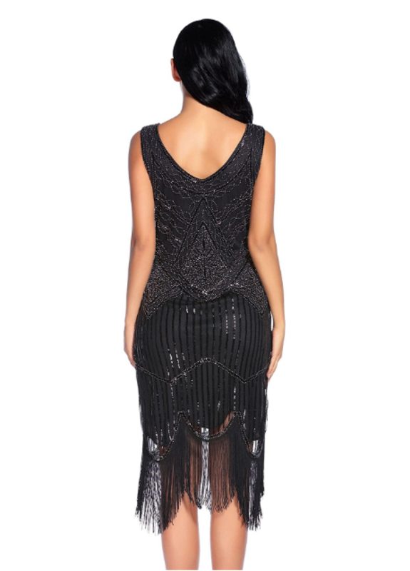 Quality Vintage Retro Black Sequin Beads Fringed Tassels Hem Party Flapper Dress Great Gatsby Dress Boutique Rockabilly Party Dress Ball Dress Womens Clothing Clothes Midi Summer Wrap Evening Cocktail Dresses