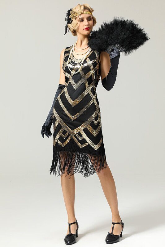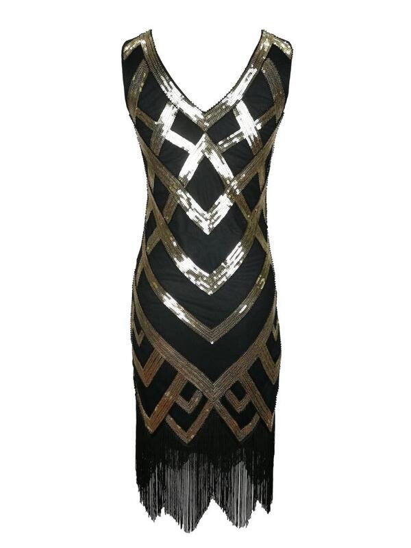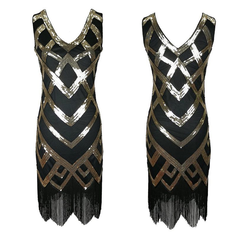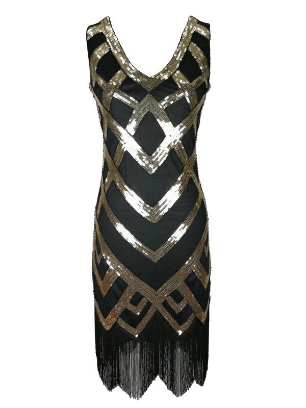 Quality Vintage Retro Black Gold Sequin Fringed Tassels Hem Party Flapper Dress Great Gatsby Dress Boutique Rockabilly Party Dress Ball Dress Womens Clothing Clothes Midi Summer Wrap Evening Cocktail Dresses