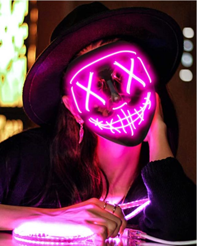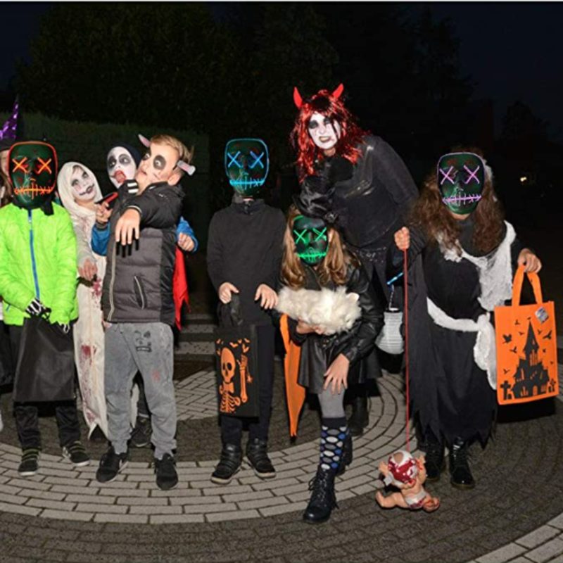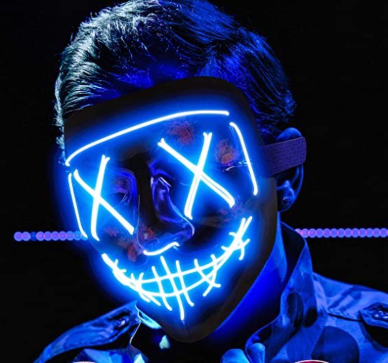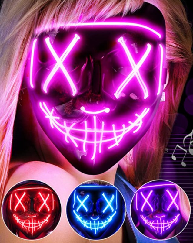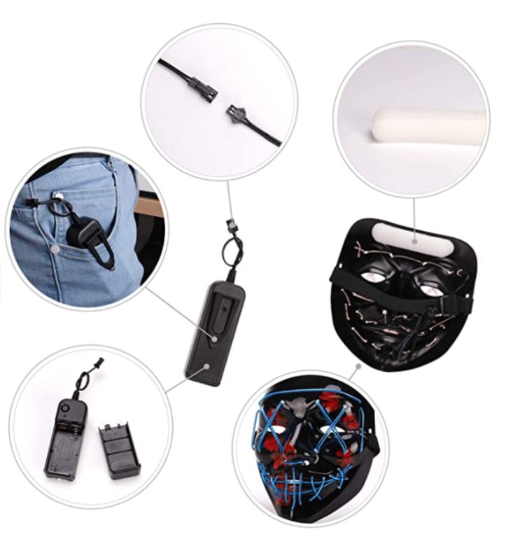 ADJUSTABLE & COMFORTABLE & BREATHABLE - Designed with an adjustable strap, allows you to easily adjust the mask for small, medium, large size heads.The LED Purge Mask Light Up Halloween Face Mask fits for most adult and kids face. Designed with a foam on the inner forehead to keep you comfortable even wearing a long time.You can clip the power pack to your pocket or onto your clothing.