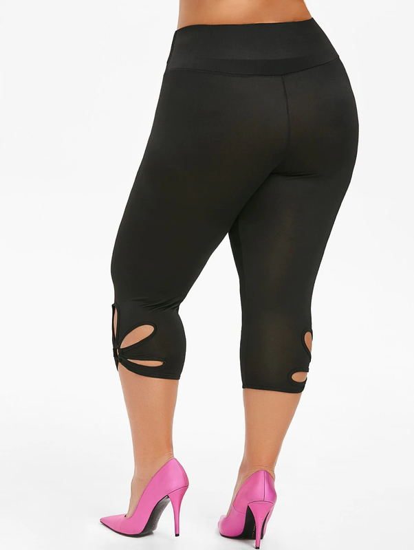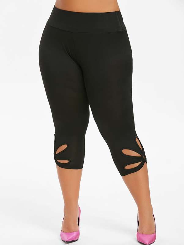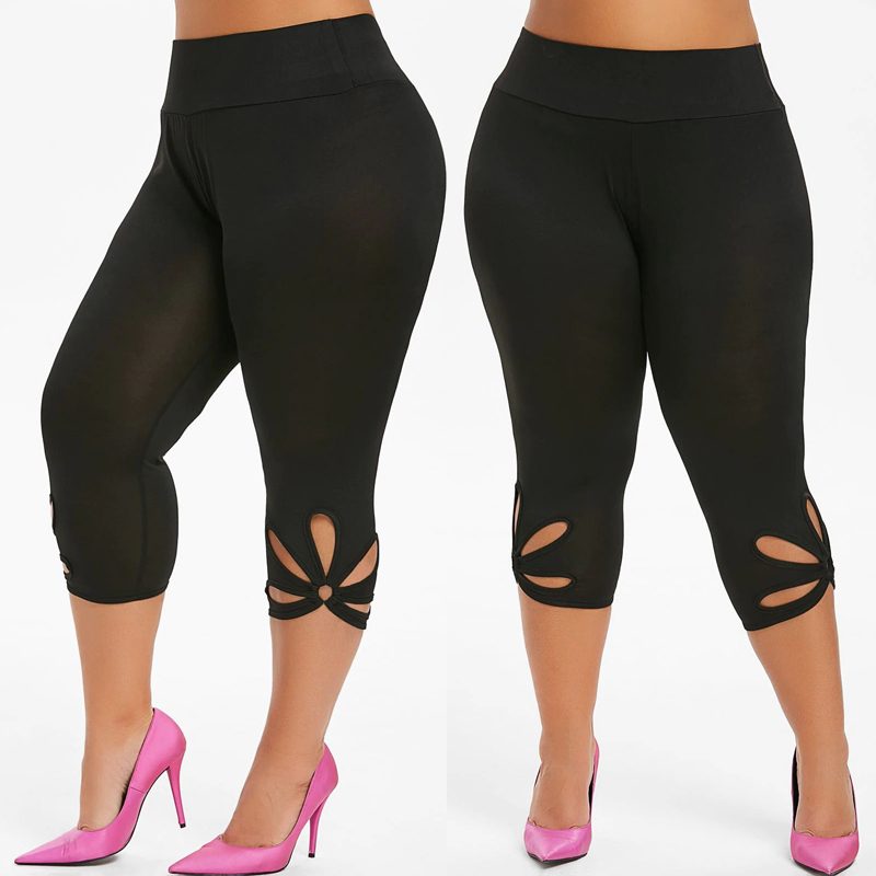 Brand New Black Metal Ring Floral Hollow Cut Out Capri Gym 3/4 Length Skinny Leggings Tights Jeggings Pants Trousers Womens Clothing Clothes Plus Size