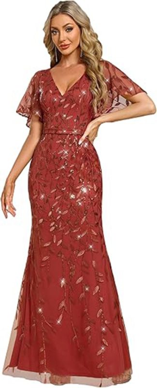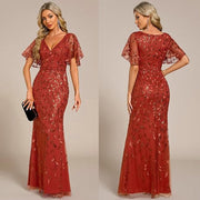 Brand New Quality Orange Flounce Sleeve Sequin Leaf Mesh Party Prom Gown Maxi Evening Cocktail Long Dress Womens Clothing Clothes Maxi Ball Summer Wrap Evening Gown Cocktail Dresses For Dinner, Party Dress, Wedding Guest Dress, Formal Evening Plus Size