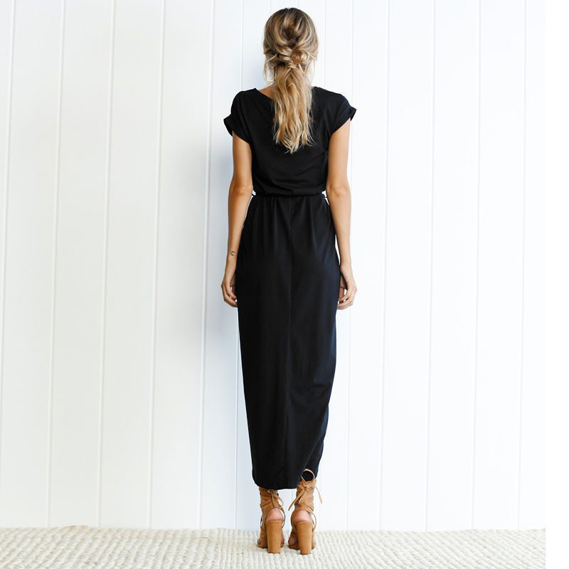 Brand New Black Short Sleeve Jersey Cotton T Shirt Style Long Dress w Front Slit Boho Summer Dresses Casual Dress Womens Clothing Clothes