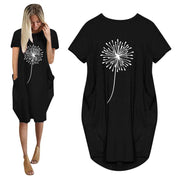 Brand New Black Dandelion Floral Print Cotton Short Sleeve Loose Fit Oversized Casual Tunic Long Dress Summer Tshirt Dresses Shirt Dress Womens Clothing Clothes Plus Size