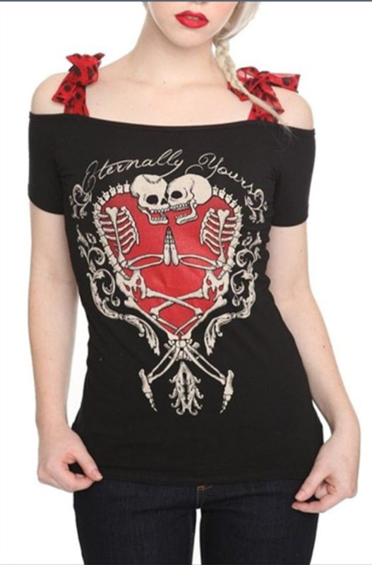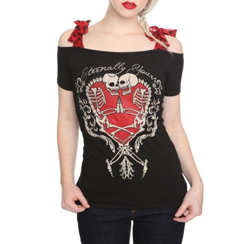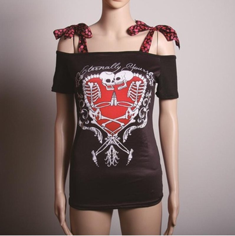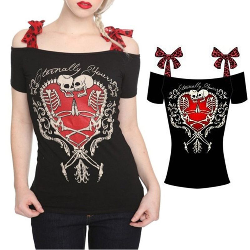 In Love Skull Skeleton Print Bow Off Shoulder Short Sleeve T Shirt Top Plus Size Punk