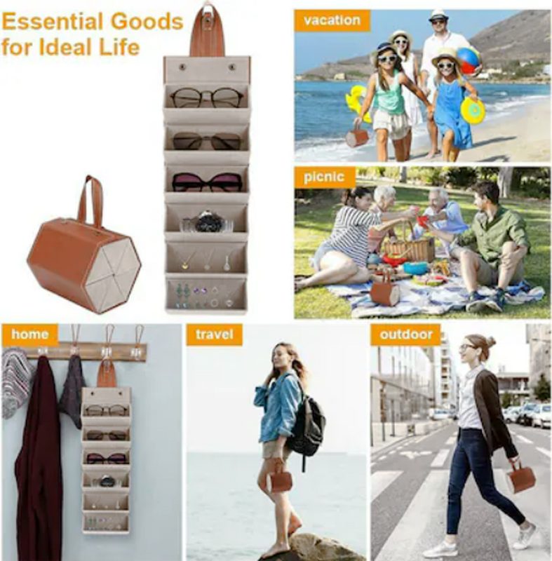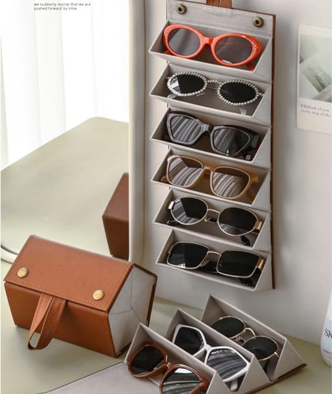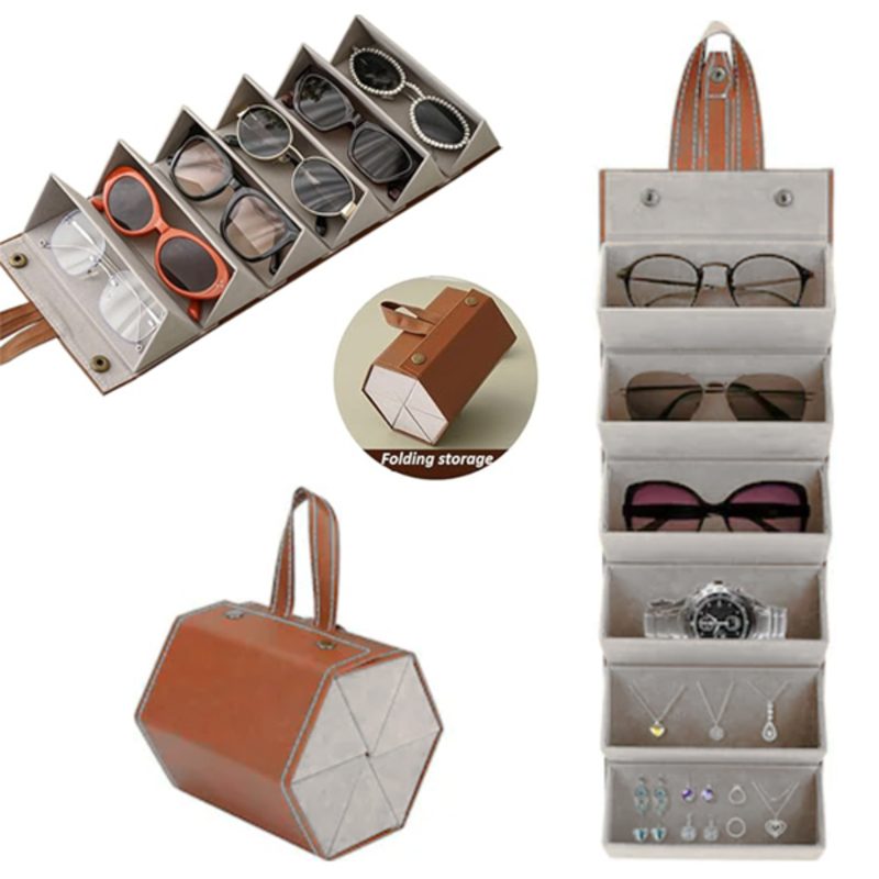 The foldable design allows for storing multiple pairs of glasses or sunglasses simultaneously, making it easy to open. Hanging design, the sunglasses storage device can be hung in the wardrobe, behind the door, or on a shelf to save space.
