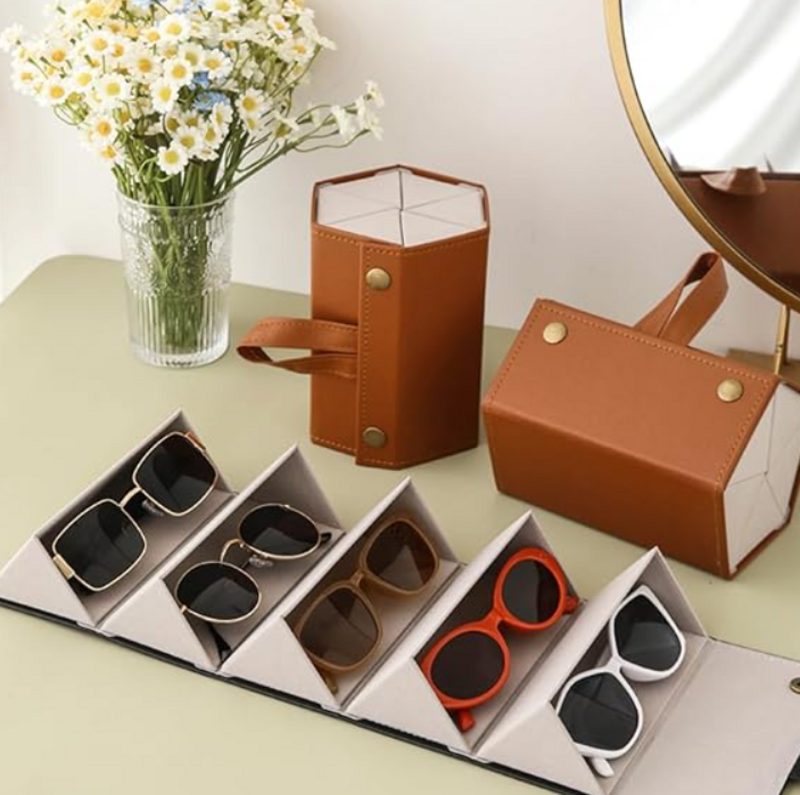 The sunglasses organizer is made of a hard PU leather outer layer, with a hard shell design to protect the glasses from compression.