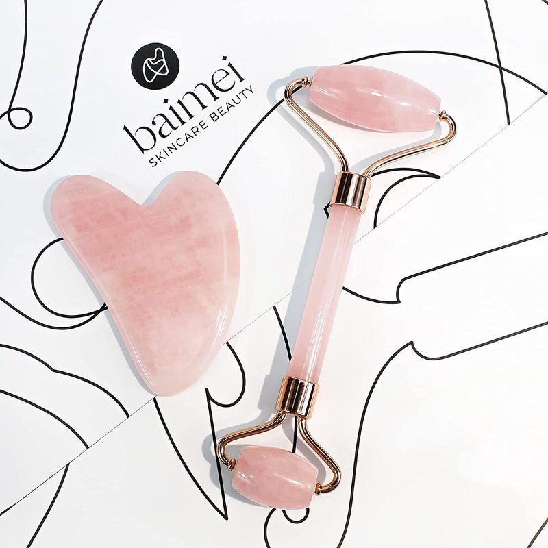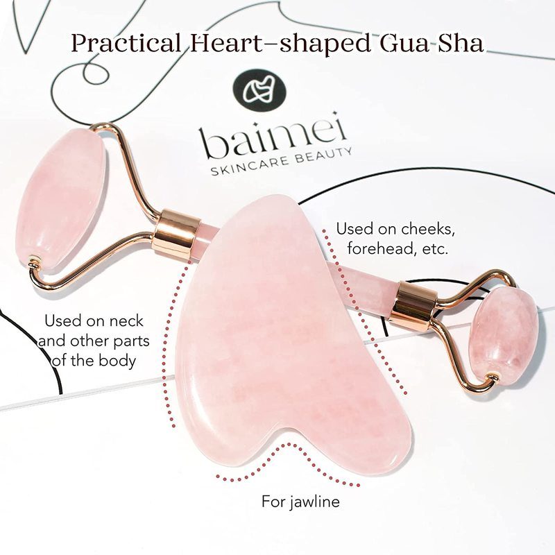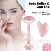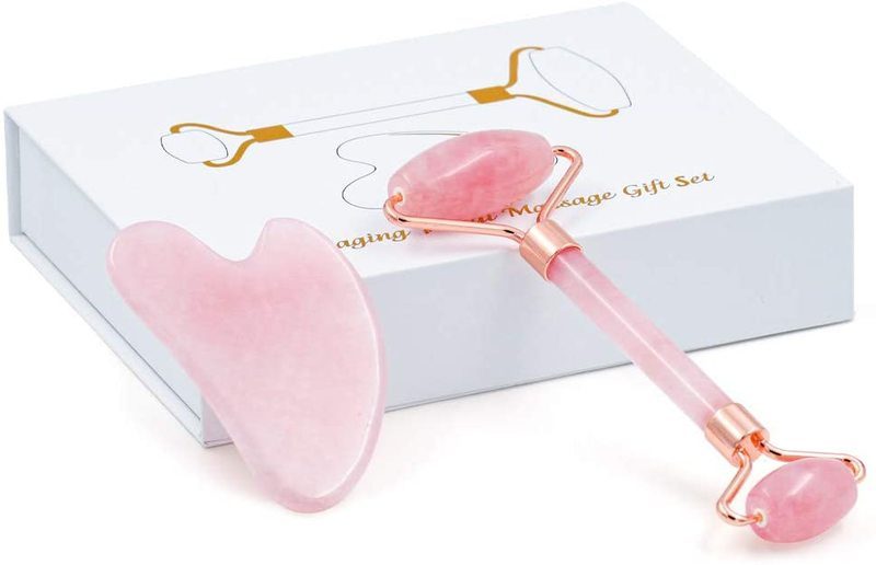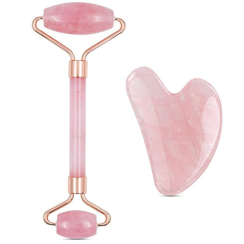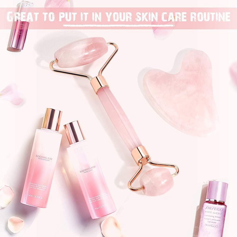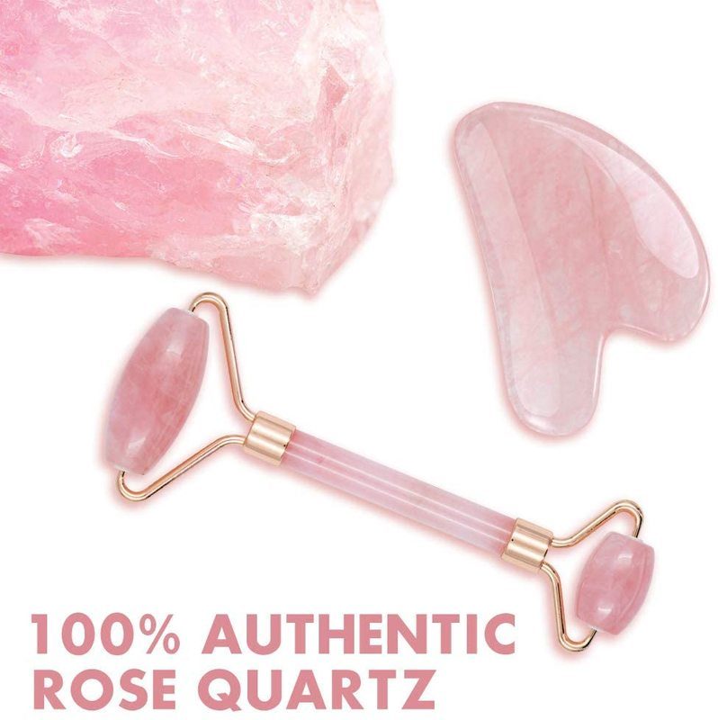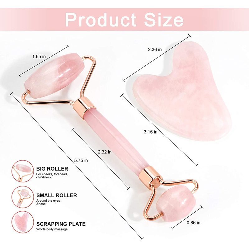 Brand New Deluxe Version 2pcs Set Rose Quartz Jade Roller for Face and Gua Sha Set Facial Skin Roller Massager Tool - Anti-Aging Treatment - Handcraft Natural Rose Quartz