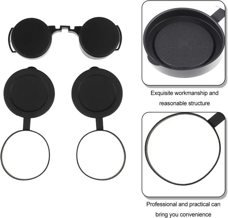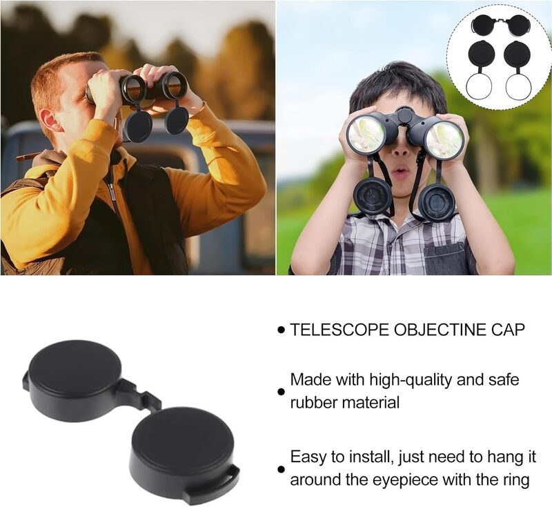 Objective lens cover-- easy to install and disassemble, convenient to use.Dust proof waterproof and scratch proof;fully protect your objective lens. Binoculars cap-- a good substitute binoculars lens cover for broken or worn out one.High quality flexible rubber is independently tethered and stretches for a tight fit.This ensures optimal protection for each lens.