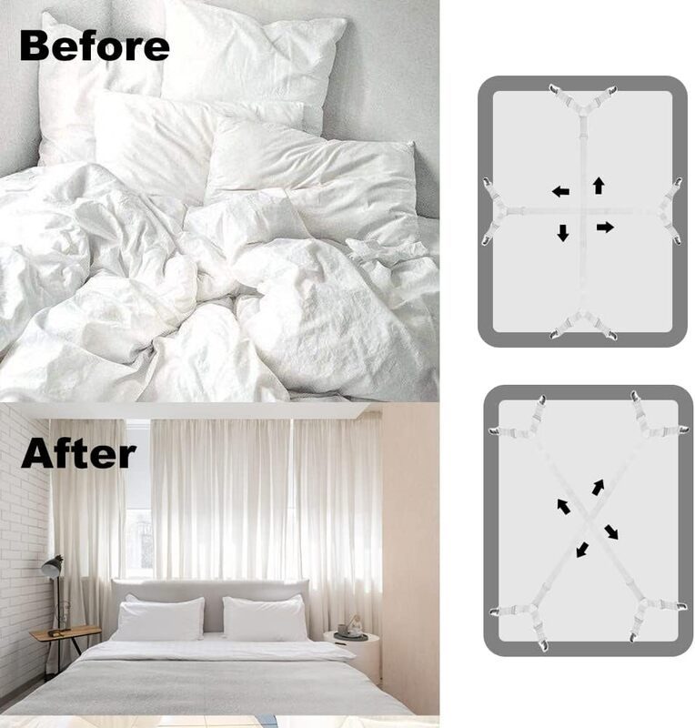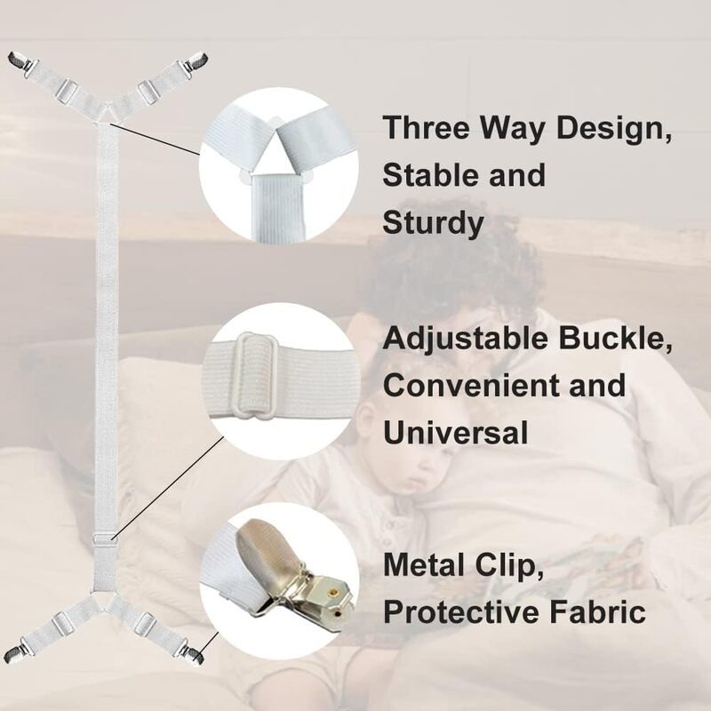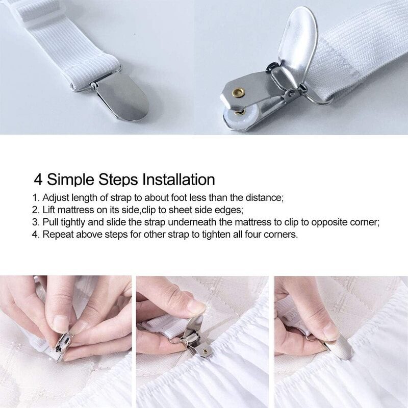 Bed sheet Fasteners Straps: Built-in plastic clenching system protects the fabric from harm; Sturdy chrome metal clips and wider elastic bands provide a stable and more robust grip for heavy-duty purposes; Perfect Fitted Bed Sheet and mattress Cover Fastening System. Hold sheets tight all night, keep your bed always looking great, and never worry about wrinkled sheets again. Make your life easier.